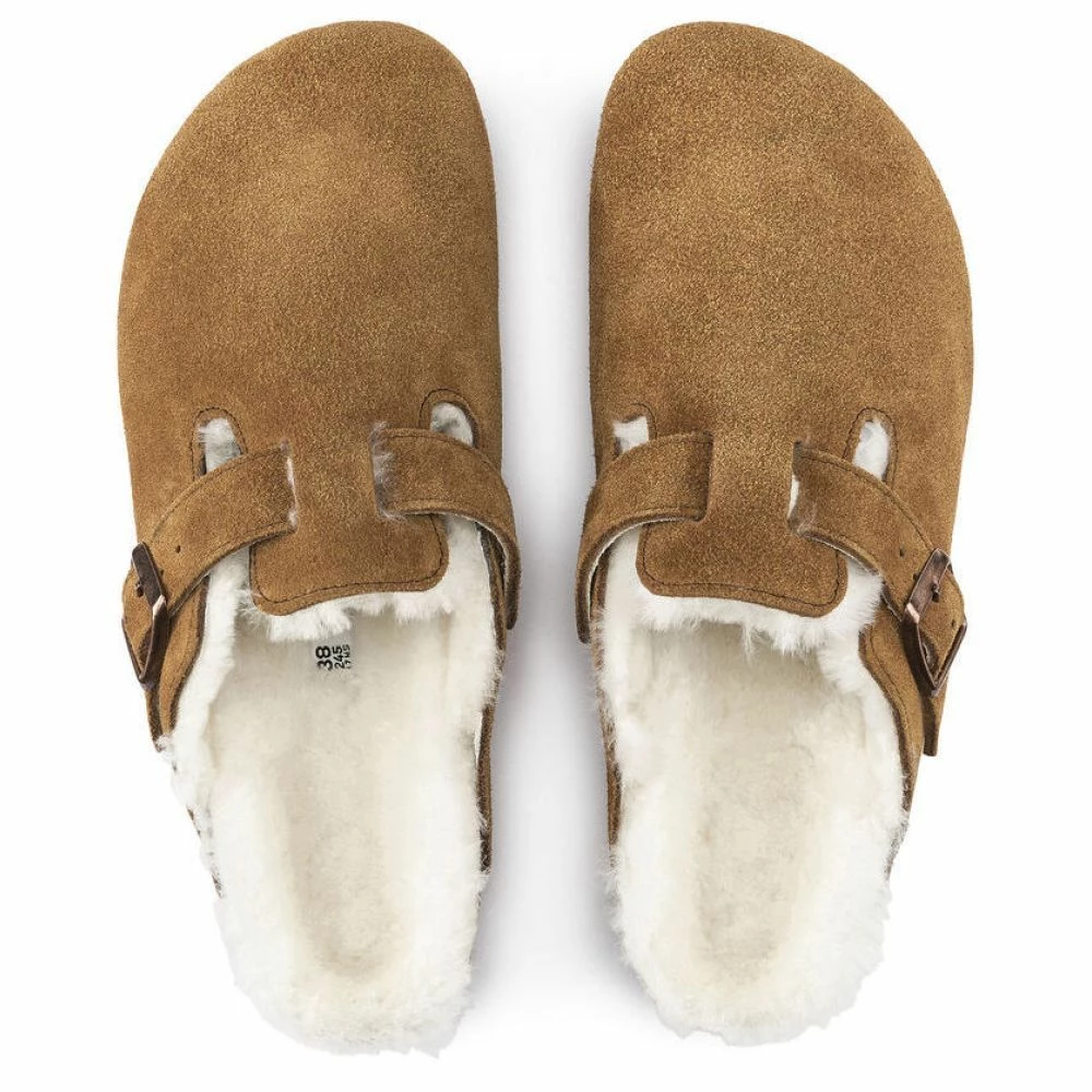 The bolder, the better! This exceptionally Birkenstock Boston Shearling Suede Leather Mink clog, a classic BIRKENSTOCK model, is made of real, very high-quality suede. The natural lambskin footbed and strap lining exudes style and keeps feet warm. The perfect shoe for cozy winter evenings by an open fire!